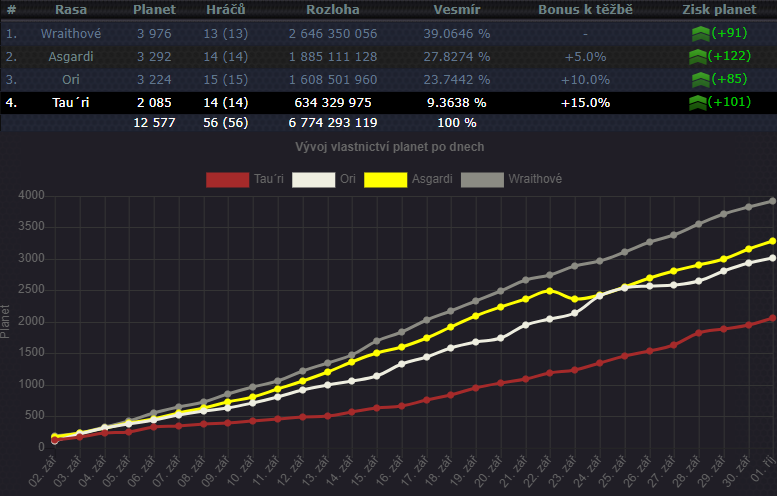 V seřazení je vidět že pořadí ras se nezměnilo avšak rozdíl obsazenosti mezi rasama se výrazně zmenšil. Zejména rasa Tauri zdá se chytá dech, avšak prozatím je to hlavně práce pár jedinců, snad onen dech chytne více hráčů. Rasy Wraithů a Asgardů šlapou na plno a jistě nás bude čekat více než jeden střet o první pozici. Nepředvídatelní Ori můžou zasáhnout do děje z obou stran a někomu pořádně zavařit.